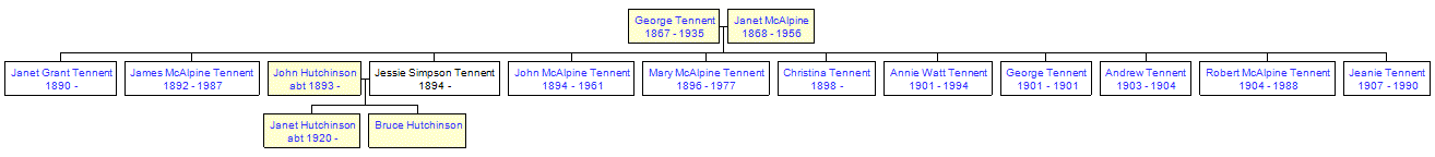 Immigrated to Canada, Arriving on the 01 March 1923, travelling 3rd Class aboard the SS Matagama of the Canadian Pacific Railway Ocean Line. Stated to be married to John Hutchinson of 204 Balmoral Avenue, Hamilton, Ontario she was born Rutherglen. She had £5in her possession. Her nearest relative in Scotland being George Tennent, Father, 3 Hamilton road, Rutherglen.